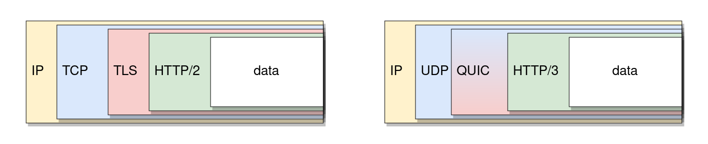 Left: HTTP/2 protocol stack. Right: HTTP/3 protocol stack.HTTP/3 data travels over the network in QUIC packets which are encapsulated in UDP datagrams. Meanwhile, traditional HTTPS data is contained in TLS frames which are packed in TCP packets.