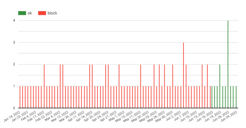 54 pages on political criticism were blocked during the testing period by and up to 4360 blocking times. Network operators may use DNS tampering and block IP addresses of these websites to blacklist and making them inaccessible. FPT and Viettel used DNS tampering whistle VNPT almost always uses TLS ‘connection timeout and close’. The result of blocking over time is a fluctuating variable.